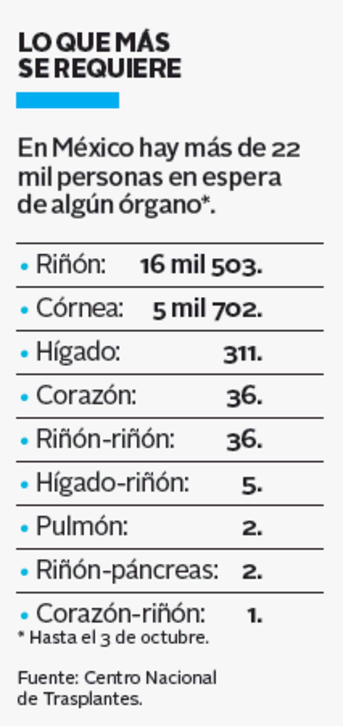 Hasta los registros del 3 de octubre, en el País hay 22 mil 562 posibles receptores de órganos y tejidos, principalmente riñón (73%) y córnea (25%), de acuerdo con las estadísticas del Centro Nacional de Trasplantes en su tercer informe trimestral.