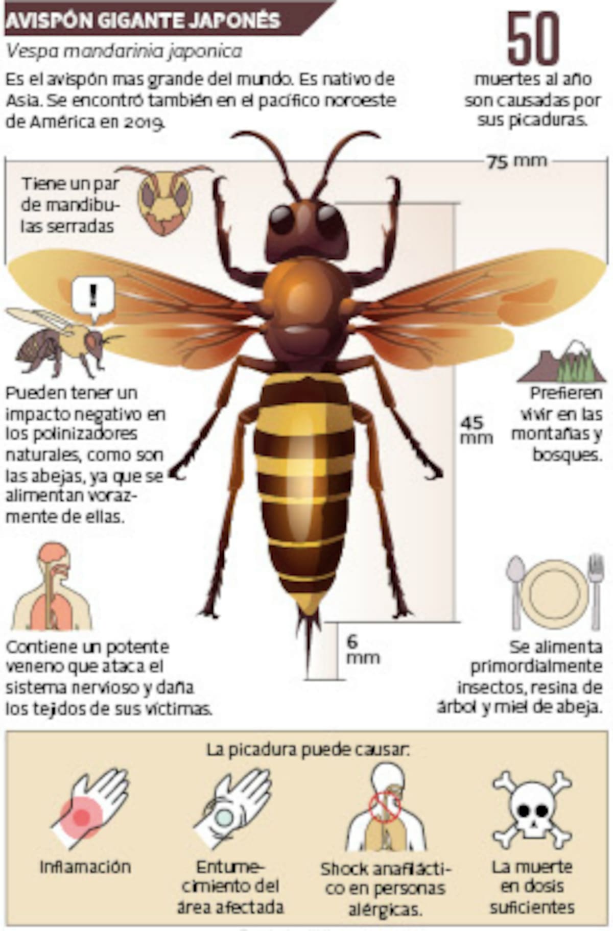 En Japón, comentó Meling, el número de muertes en humanos por esta avispa apenas supera los 50, lo cual no es muy diferente al que hay por abejas comunes en el Estado de Sonora y México.Un avispón gigante asiático de Japón es sostenido sobre un alfiler por un entomólogo del Departamento de Agricultura de Estados Unidos, esta especie representa riesgos para las abejas y, en algunos casos, para las personas.