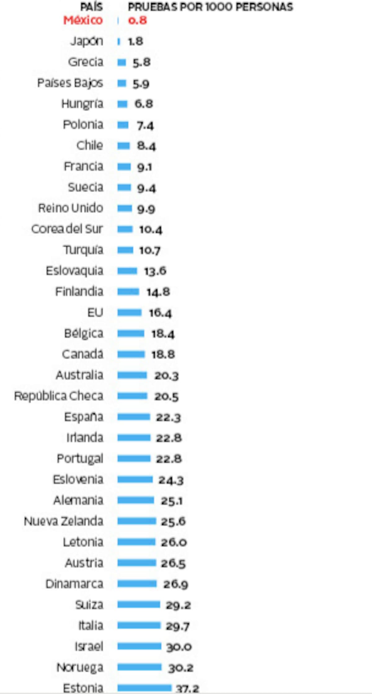 En México, el número de pruebas para diagnosticar Covid-19 son bajas ya que se realizan sólo a .8 personas por cada mil habitantes, de acuerdo con datos de la OCDE, grupo al que pertenecen los países con las mayores economías del mundo. México aparece al fondo de la tabla.