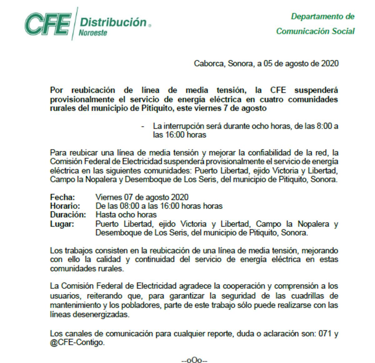 HERMOSILLO, Sonora.- Este miércoles la Comisión Federal de Electricidad (CFE) informó que debido a la reubicación de línea de media tensión suspenderá provisionalmente el servicio de energía eléctrica en cuatro comunidades rurales del municipio de Pitiquito el viernes 7 de agosto.