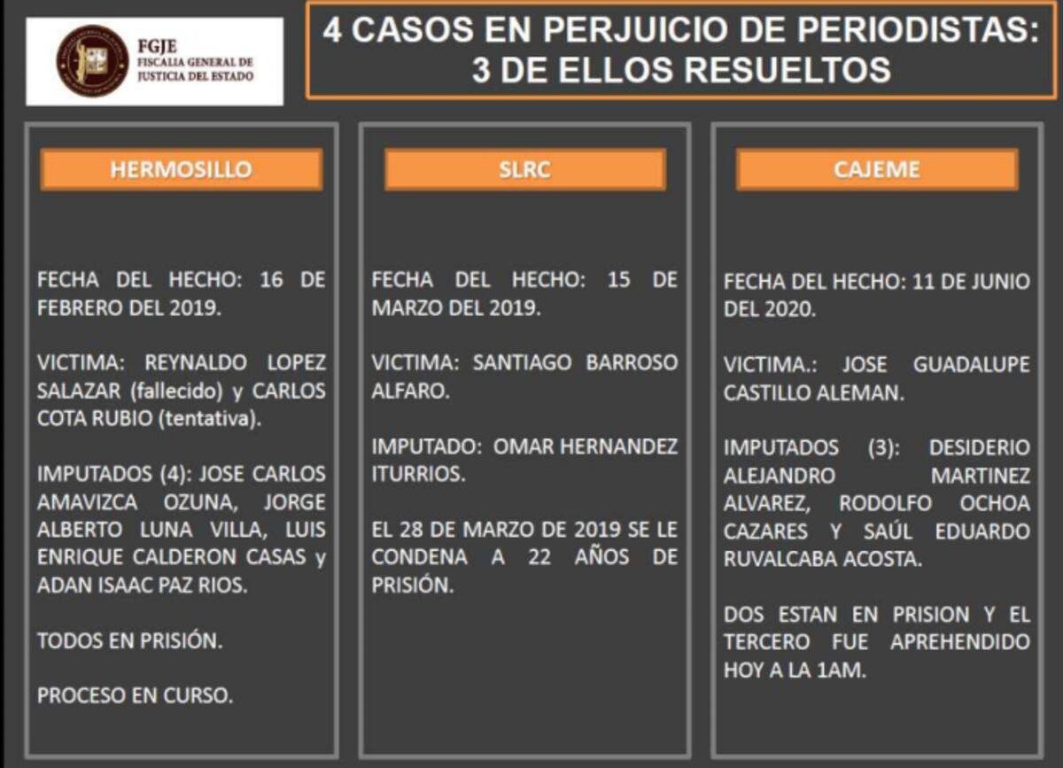 El caso resuelto más reciente es el del periodista José Guadalupe Castillo Alemán, asesinado el 11 de junio del presente año en Cajeme, tras la captura de tres imputados.