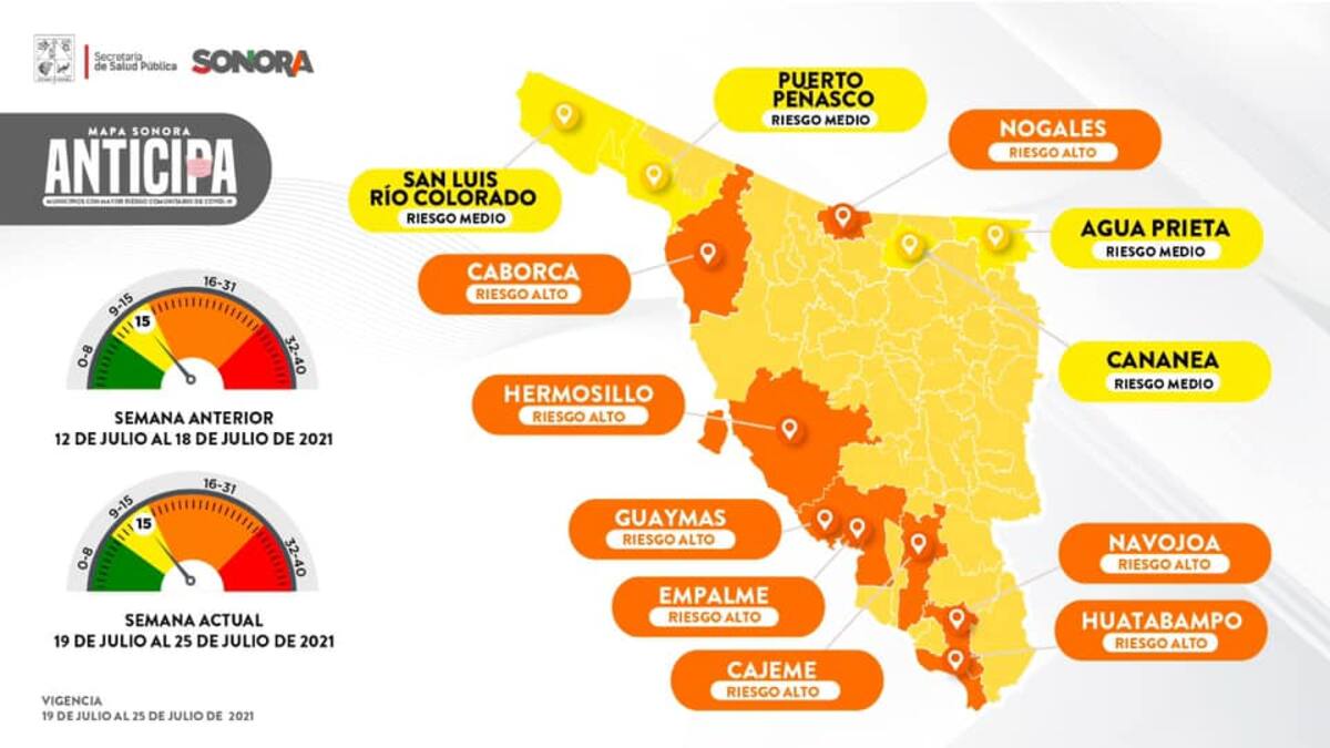 HERMOSILLO, Sonora.- Un total de 10 de los 12 municipios que evalúa cada semana el Mapa Sonora Anticipa aumentaron su nivel de riesgo por Covid-19 esta semana y Sonora se encuentra en 19 puntos de 20 que se necesitan para pasar a naranja en el Semáforo Epidemiológico Nacional.