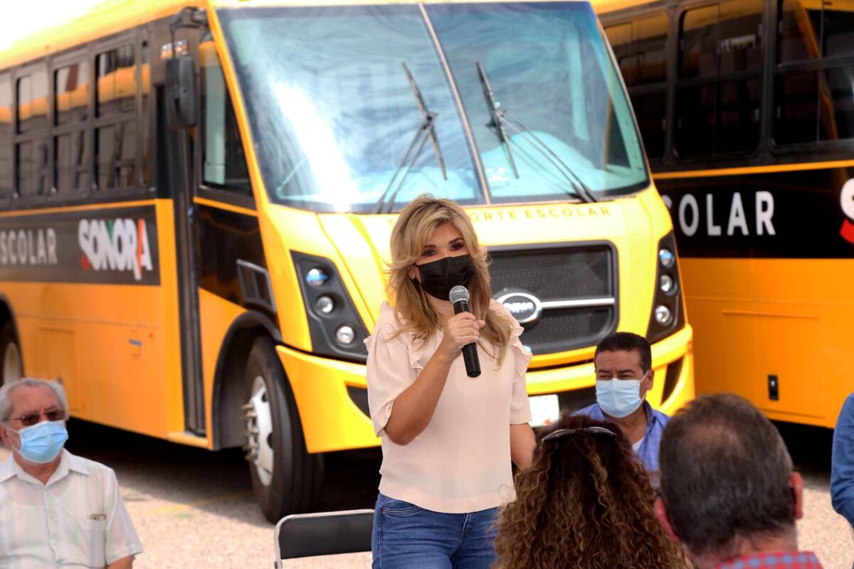 Para que estudiantes de comunidades alejadas se puedan trasladar de forma segura y gratuita a sus escuelas, la gobernadora Claudia Pavlovich entregó seis camiones escolares que beneficiarán a niños y jóvenes de Hermosillo, San Miguel de Horcasitas y Baviácora, una vez que se reanuden las clases presenciales en sus respectivas regiones.