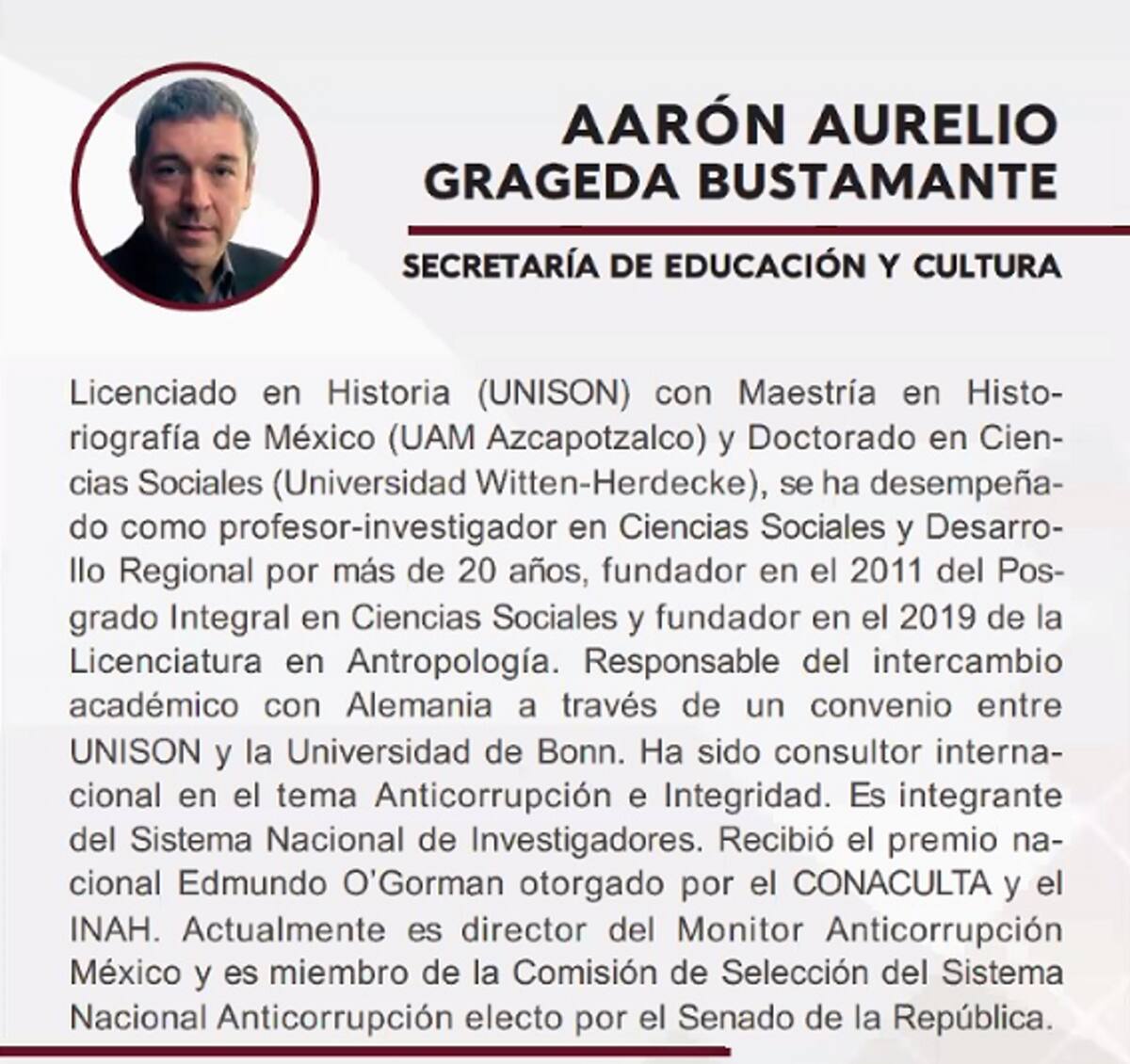 Aarón Grajeda Bustamante será titular de la Secretaría de Educación y Cultura.