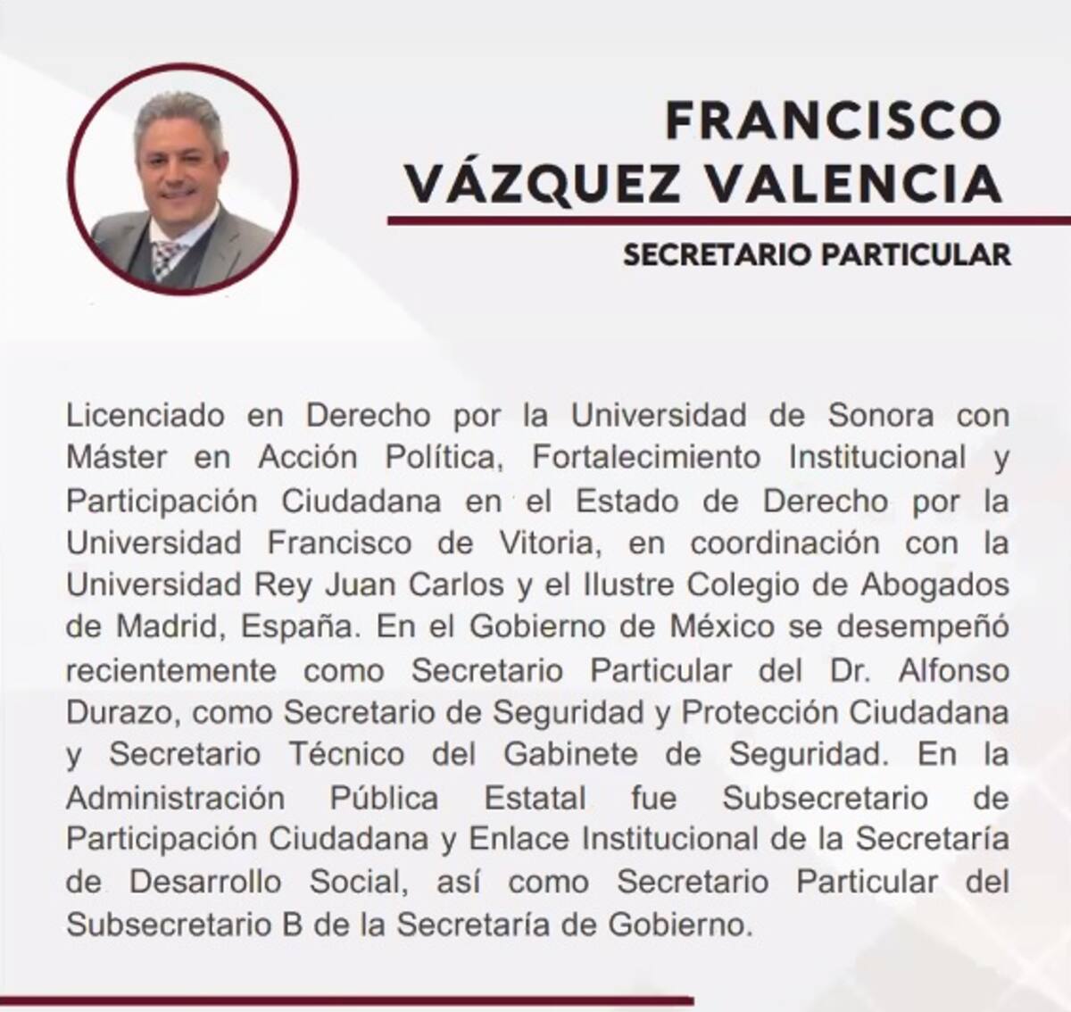 HERMOSILLO, Sonora.- El gobernador electo Alfonso Durazo Montaño anunció los nuevos nombramientos de quienes integrarán el gabinete legal y ampliado para su próximo gobierno.