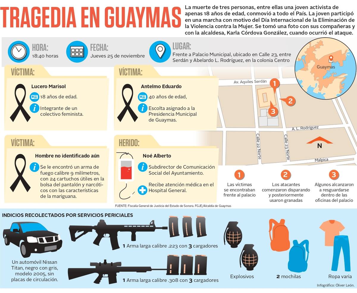 Un sujeto atacó el jueves el Palacio Municipal de Guaymas con ráfagas de arma de fuego y una granada, con saldo de un policía muerto y una activista del Colectivo Feminista del Mar, que realizaba en el sitio una manifestación pacífica.