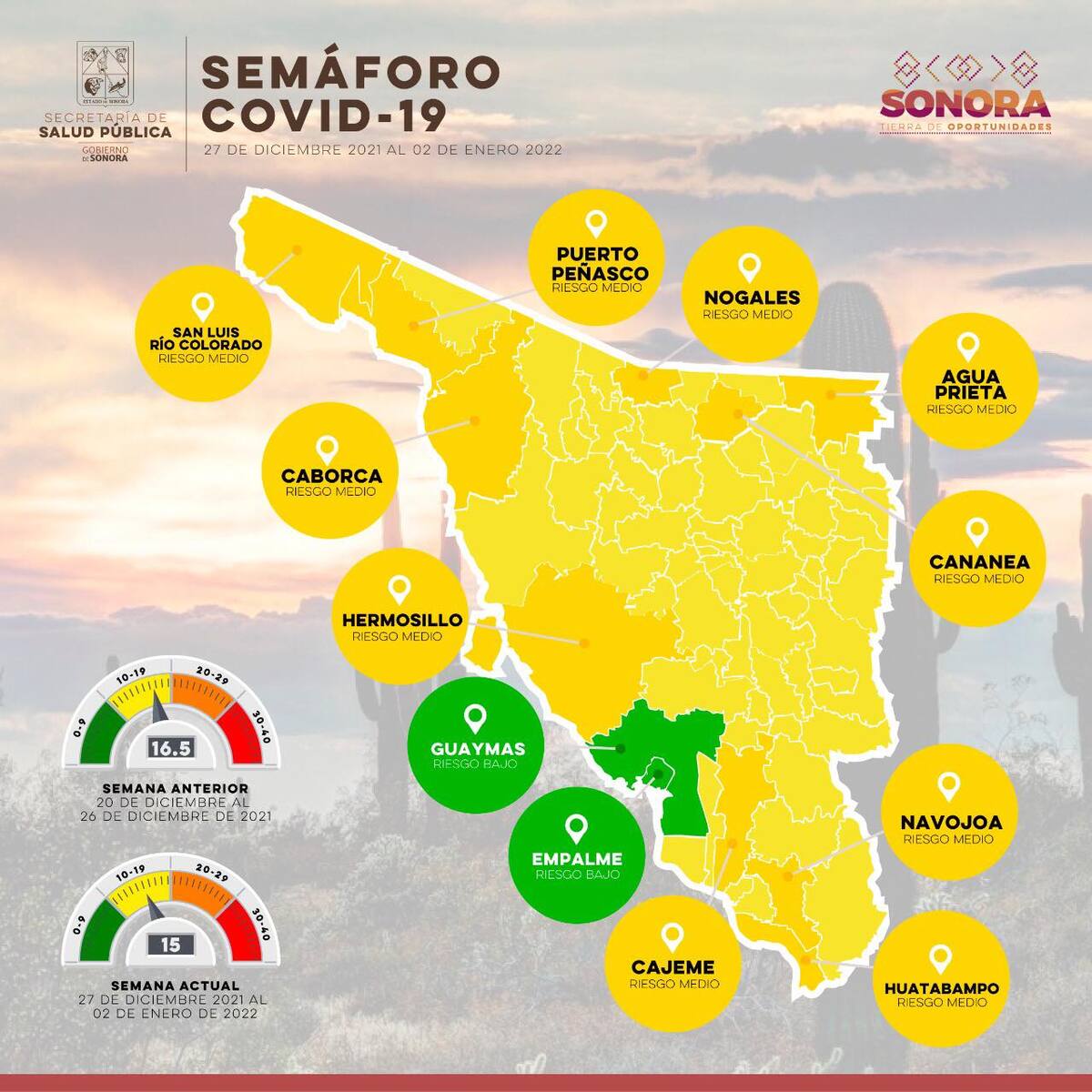 En cuanto a la actualización del Semáforo Covid-19, que estará activo del 27 de diciembre de 2021 al 2 de enero de 2022, los municipios en riesgo bajo (color verde) son Guaymas y Empalme; mientras que en riesgo medio (color amarillo) son Hermosillo, Cajeme, Huatabampo, Navojoa, Cananea, Agua Prieta, Nogales, Puerto Peñasco, San Luis Río Colorado y Caborca.