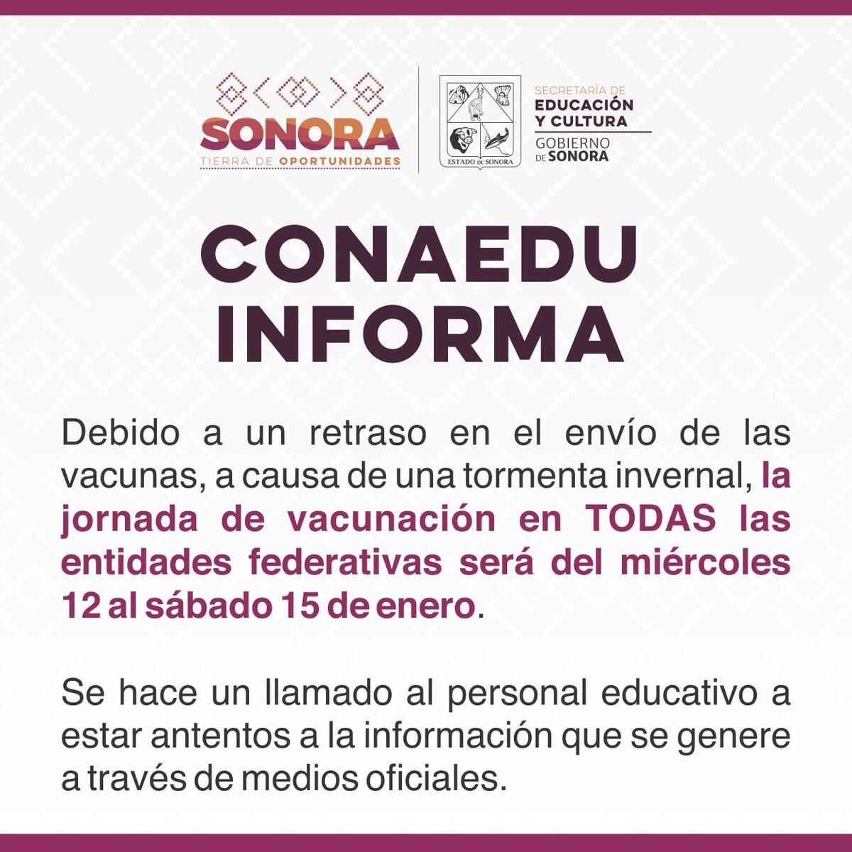 HERMOSILLO, Sonora.- La vacunación a maestros de Sonora con la dosis de refuerzo será pospuesta para el próximo 12 de enero y hasta el 15 de enero, según informó la Conaedu (Consejo Nacional de Autoridades Educativas).