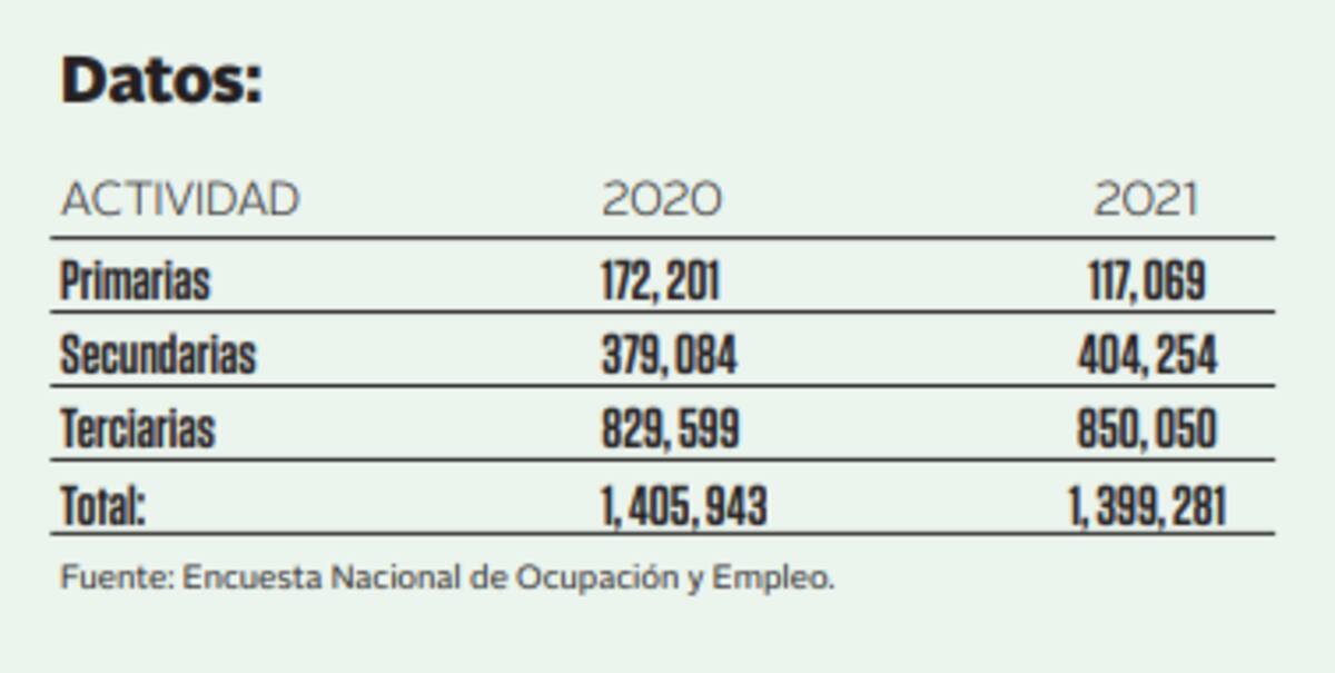 En el caso de las actividades primarias como la agricultura, silvicultura, caza y pesca, su participación fue de 8.4% en el total de la ocupación, lo que representó una disminución de 55 mil comparado al cuarto trimestre de 2020.