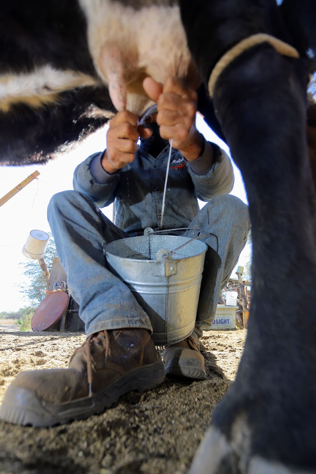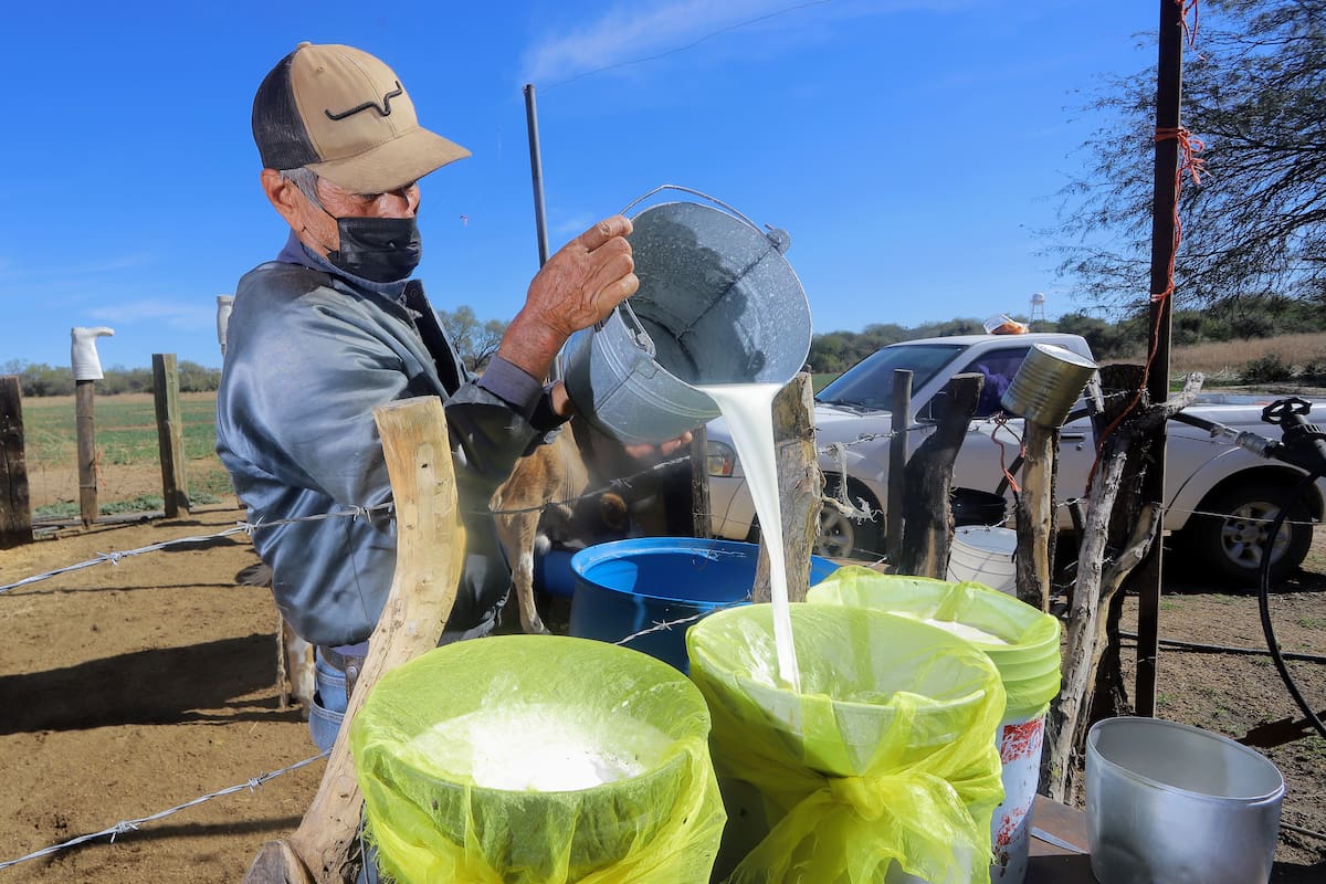 Arcenio Burruel explica que a las 06:00 horas va al rancho a la ordeña y la leche que vierte en cubetas de 20 litros la cuela y pasa a una tina donde agrega cuajo.