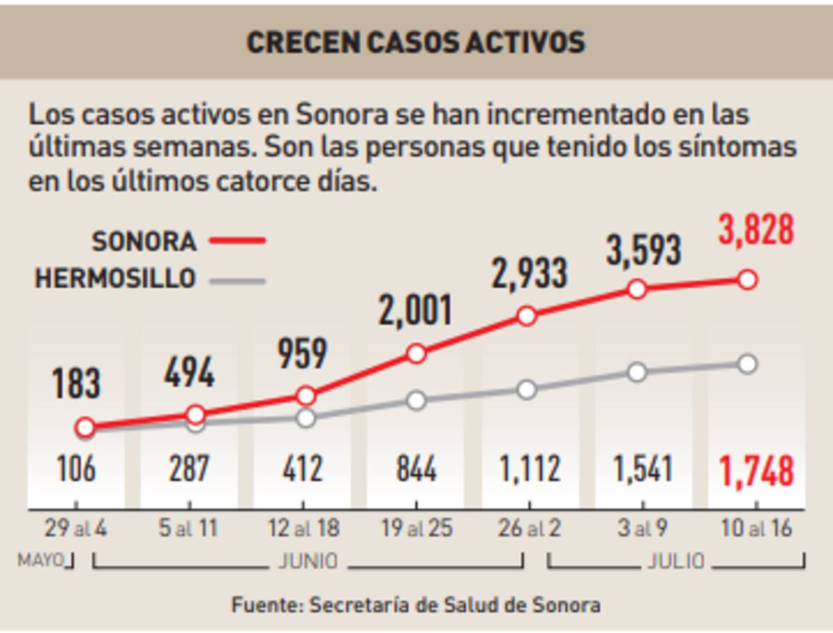 HERMOSILLO, Sonora.- Un aumento del 10% registró Sonora en el número de casos en la última semana en relación a la anterior, de acuerdo con datos de la Secretaría de Salud; fueron mil 898 nueos contagios entre el 10 y el 16 de julio, contra los mil 720 casos del anterior periodo.