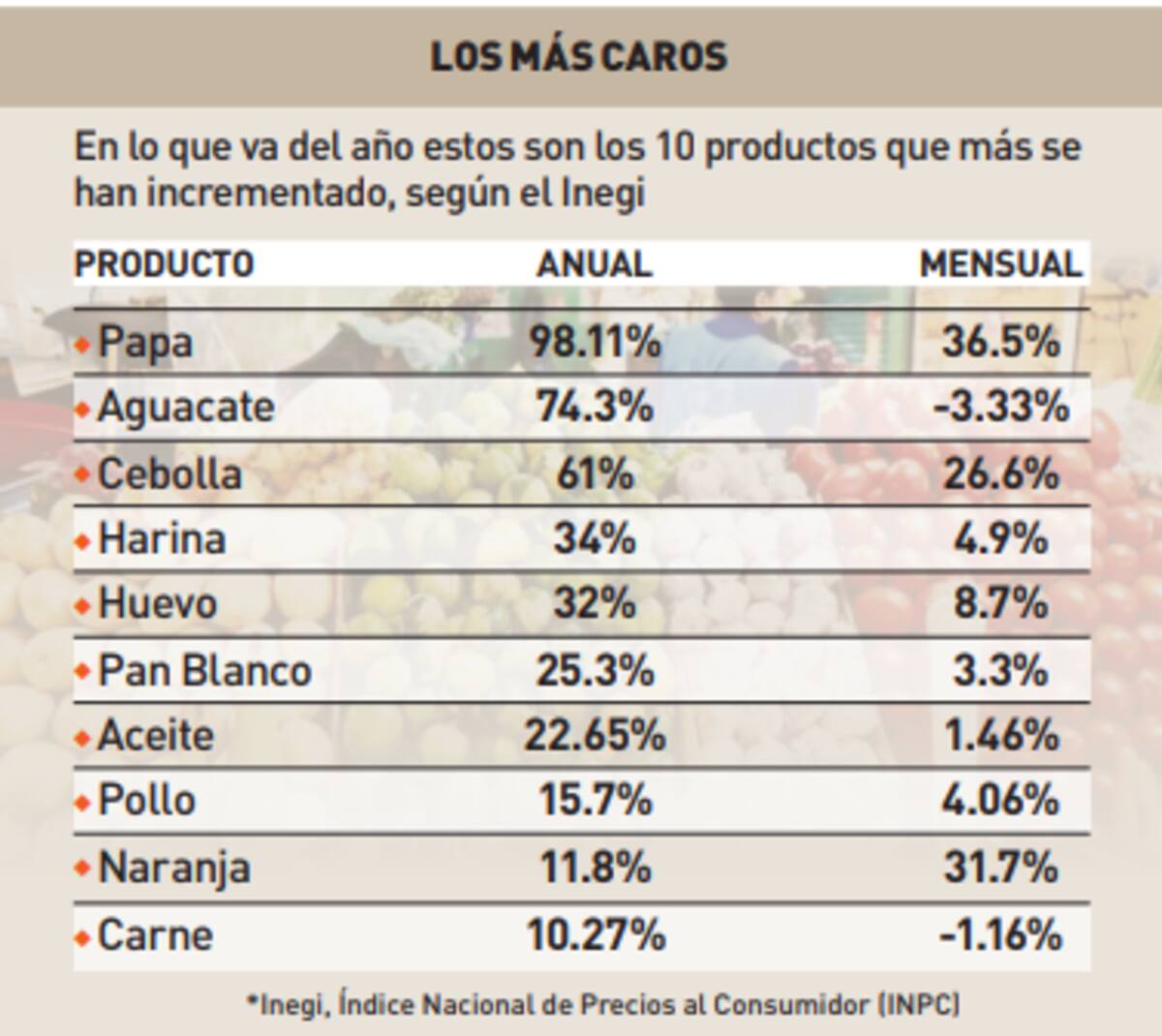 Los productos como frutas, verduras y cárnicos son los que más registran aumentos, por lo que las autoridades mexicanas debe fomentar la inversión, sobre todo en el sector alimentario, destacó.