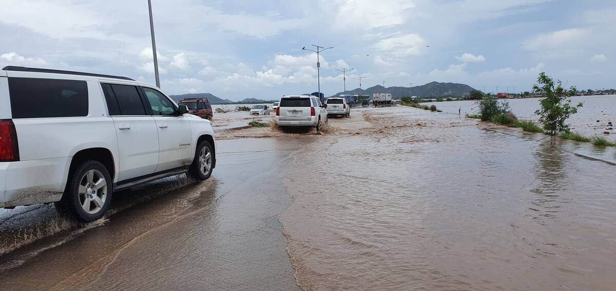 Guaymas, Sonora - El carril de sur a norte de la carretera Federal México 15 a la altura del puente Douglas en el municipio de Guaymas se encuentra completamente inundado derivado de los escurrimientos de las lluvias que se han presentado en la parte alta del Estado.