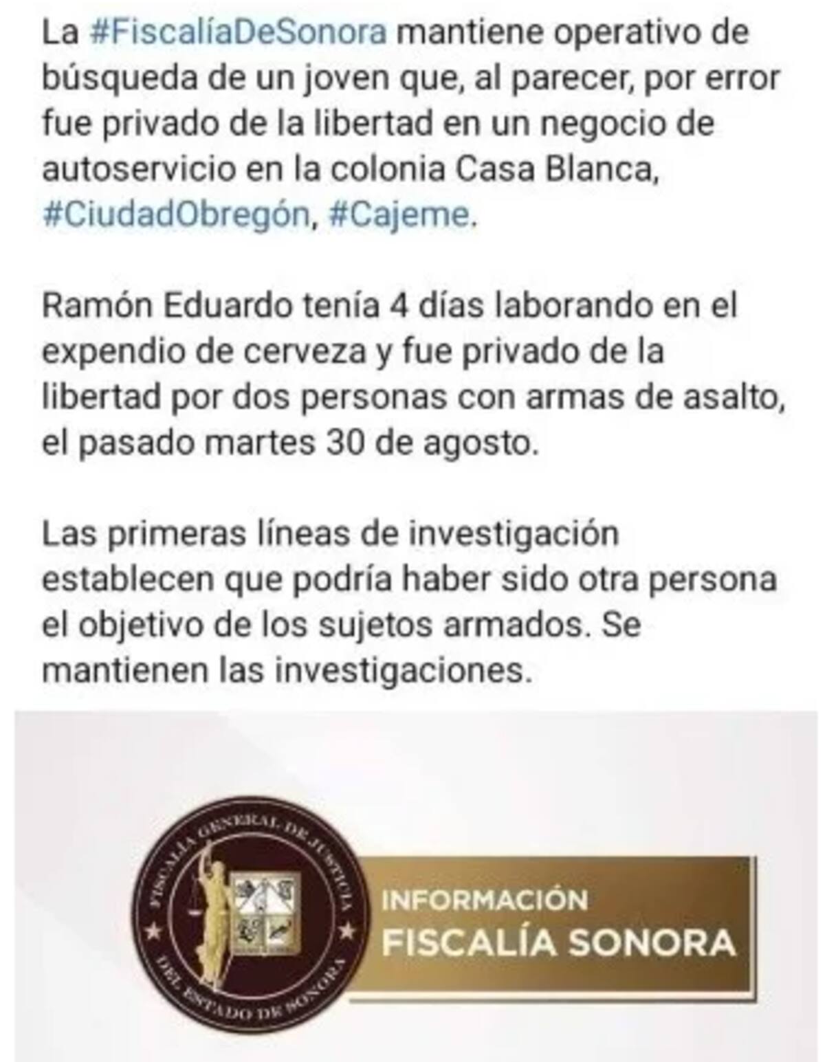 CIUDAD OBREGÓN.- Apoyo para localizar a Ramón Esquer Tejeda, quien fue privado de la libertad por un comando armado el pasado martes en una tienda de conveniencia de la colonia Casa Blanca, solicitan sus familiares y el colectivo "Guerreras buscadoras de Ciudad Obregón".