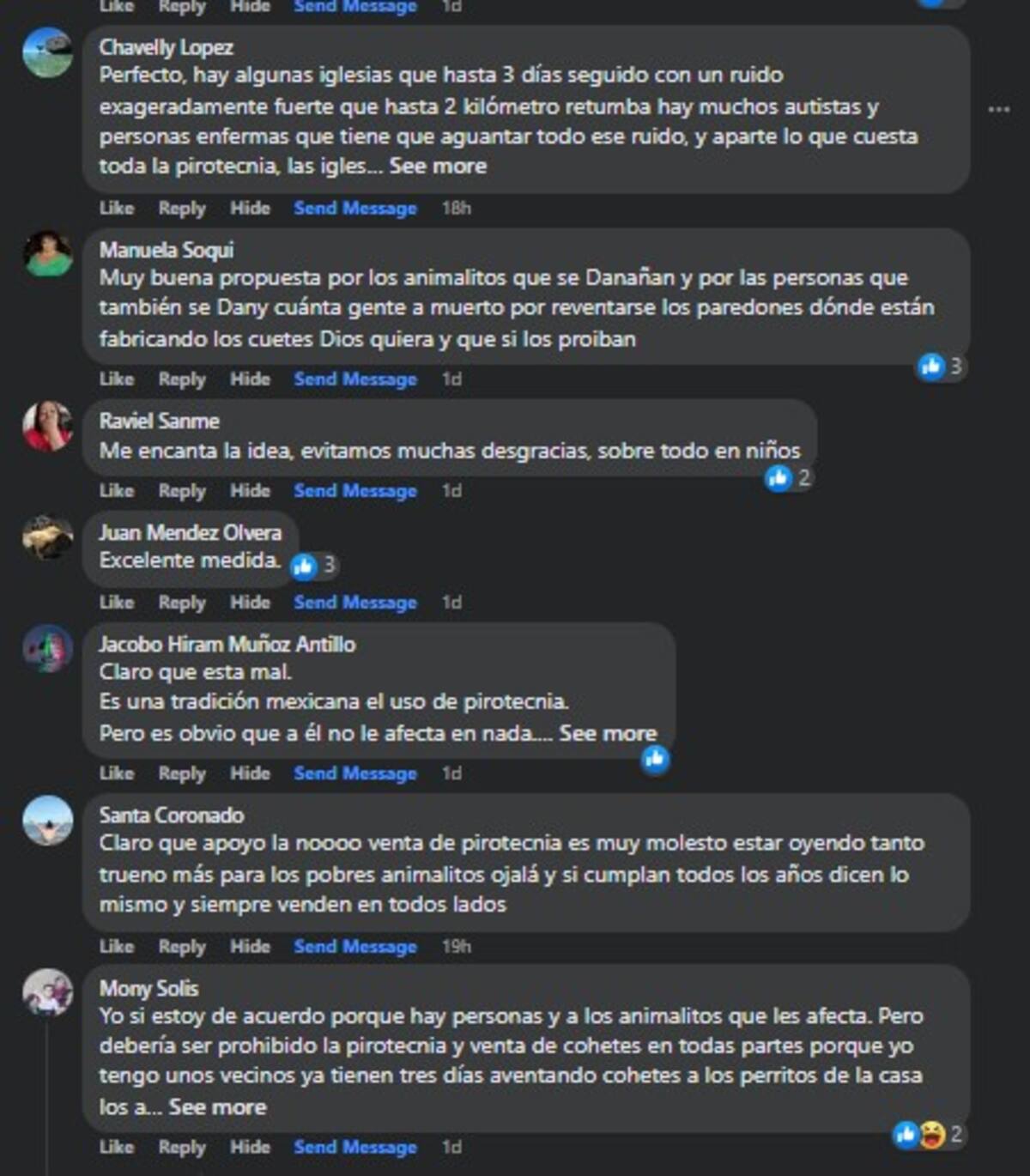 Por un lado quienes están a favor de prohibir la pirotecnia lo ven como "un buen paso" para evitar posibles accidentes además de los daños que causa en personas autistas o mascotas.