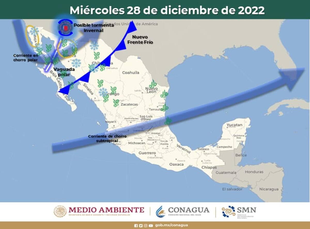 HERMOSILLO.-Se espera que esté miércoles 28 de diciembre ingrese un nuevo frente frío (el número 20) por el noroeste de Sonora, que se desplazará rápidamente por el Estado y se asociará a una vaguada polar que se extenderá sobre la entidad.