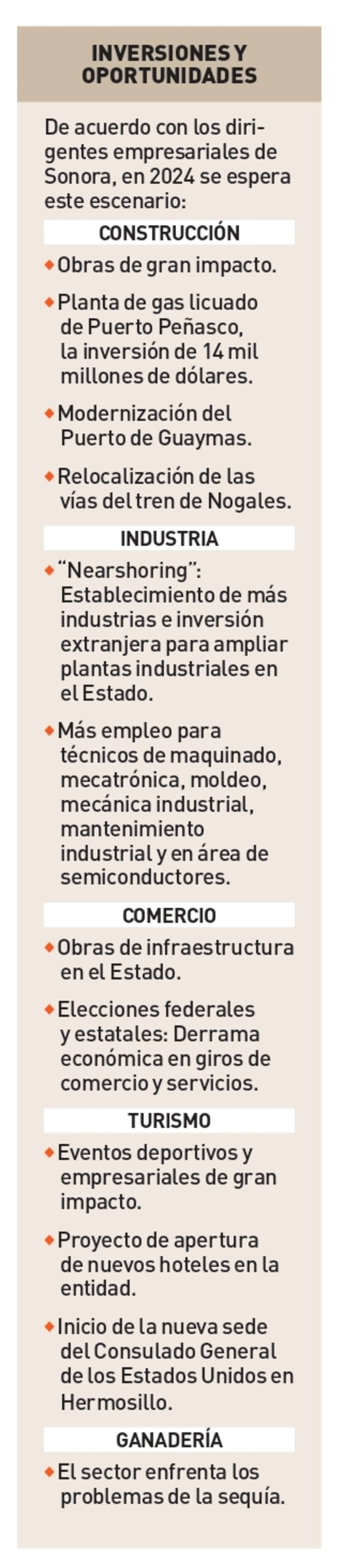 “El Gobierno del Estado sigue con infraestructura en el puerto de Guaymas, en el cambio de las vías del tren en Ímuris-Nogales, el crecimiento de la planta fotovoltaica y lo más importante que está por venir es la planta de gas licuado, eso nos da un panorama muy interesante para el sector terciario para 2024”, destacó.