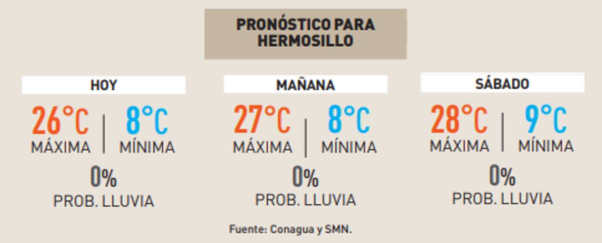Las temperaturas mínimas serán por debajo de los 0ºC, en las zonas alta de la sierra Norte y Oriente del Estado, mientras que para el Centro y Sur, los valores podrían andar por debajo de los 10ºC, incluyendo Hermosillo.