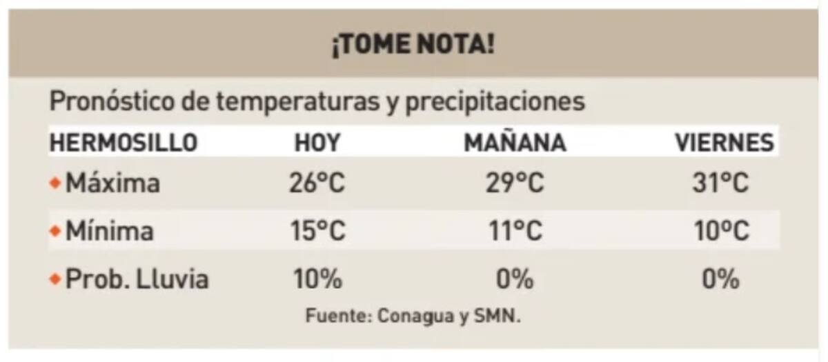 Hasta las 17:00 horas de ayer, el Observatorio Meteorológico había registrado en Hermosillo una precipitación acumulada de 2.0 milímetros y para hoy miércoles, la probabilidad de lluvia es de hasta un 10%, según datos publicados por la Conagua Sonora.