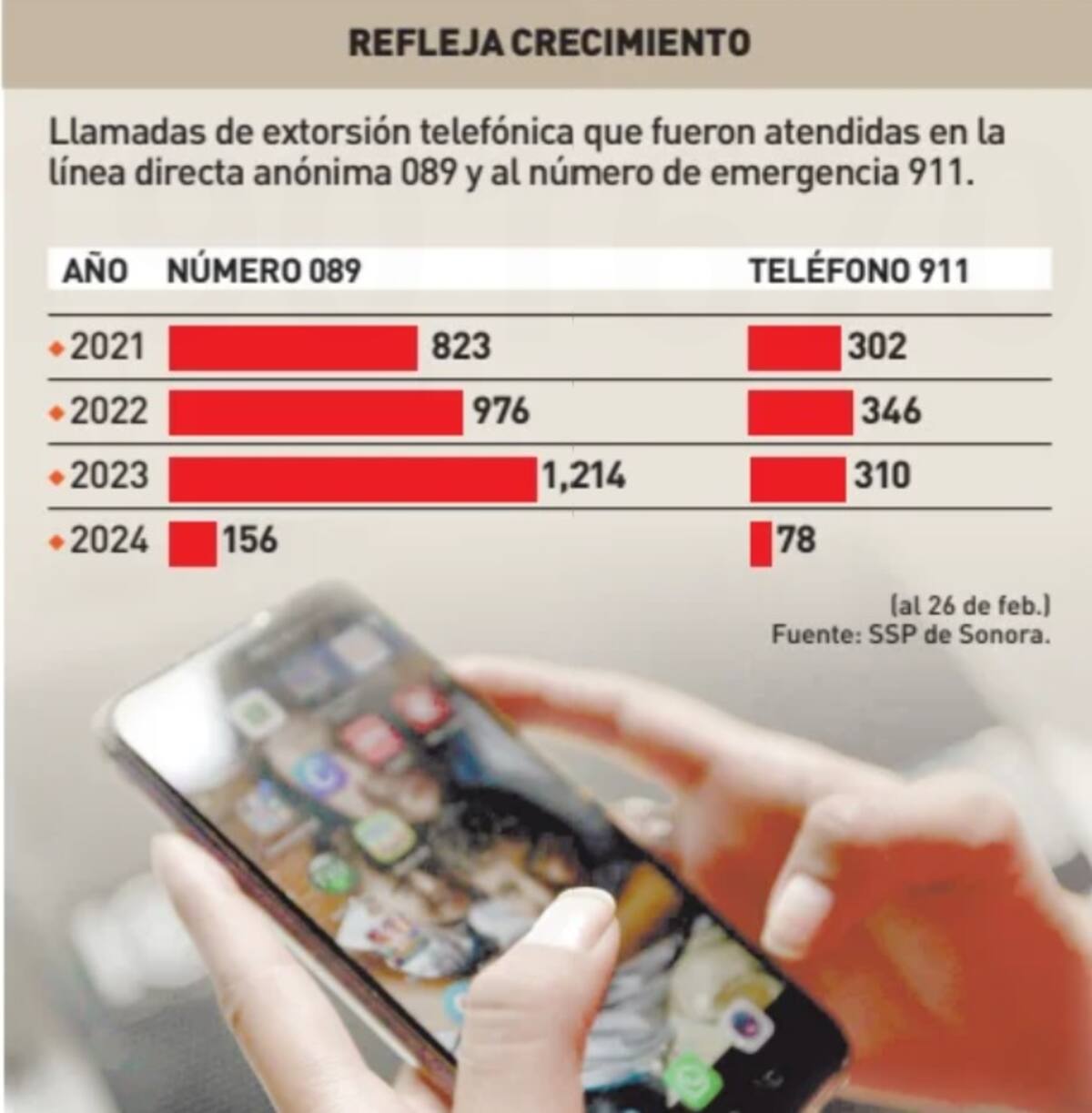 Tan sólo en el 2023 el Centro de Atención a Llamadas de Emergencias (Calles) en Sonora recibió mil 524 reportes por este delito, lo que representa un incremento del 13% con respecto al 2022 cuando se atendieron mil 322 reportes a través del 911 y del 089.
