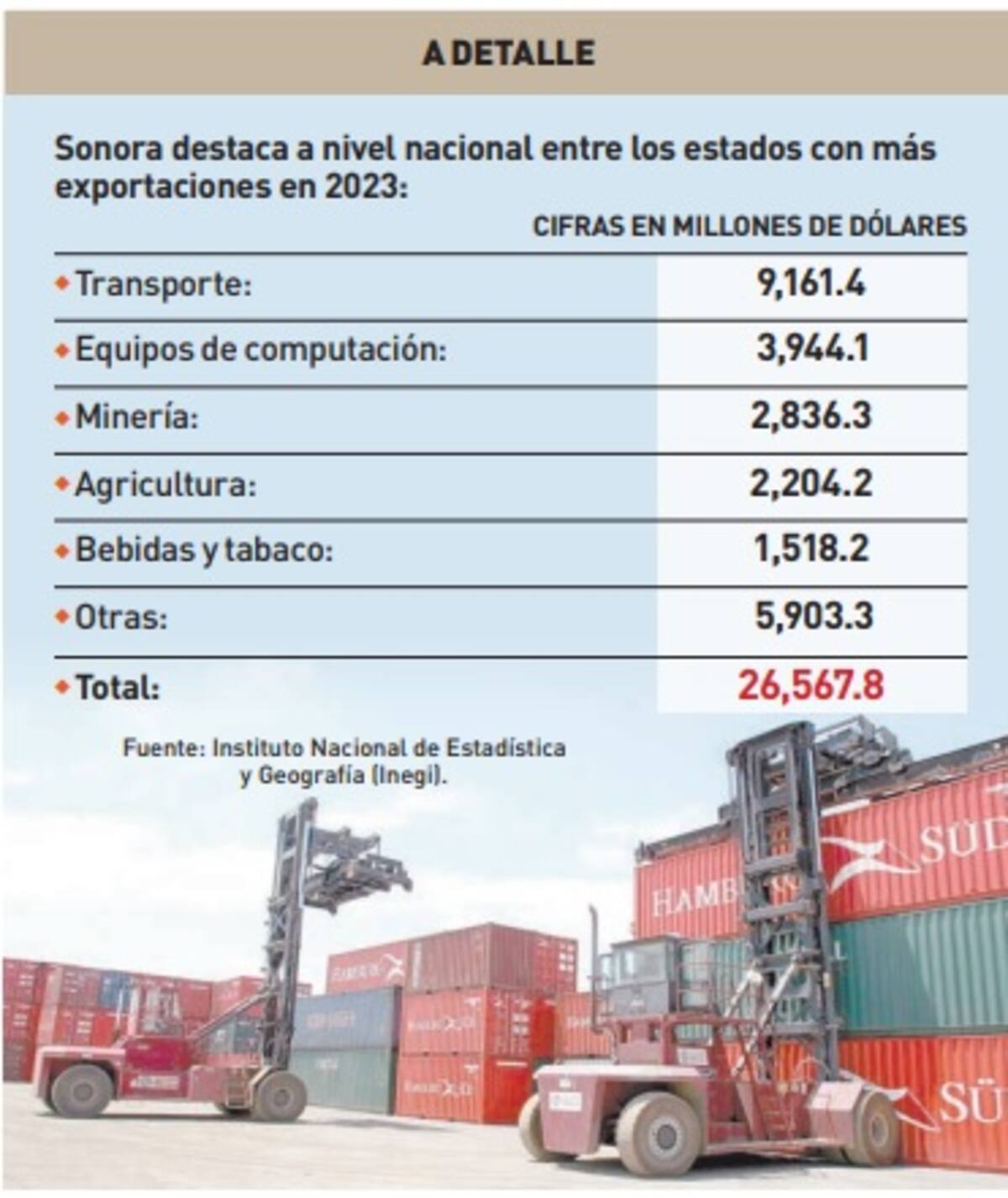HERMOSILLO, Sonora.- Las exportaciones en el Estado de Sonora crecieron en un 10% durante el 2023 al cerrar con 26 mil 567 millones 830 mil dólares contra 23 mil 866 millones 267 mil dólares del 2022, lo que posicionó a la entidad en el séptimo lugar en el País.
