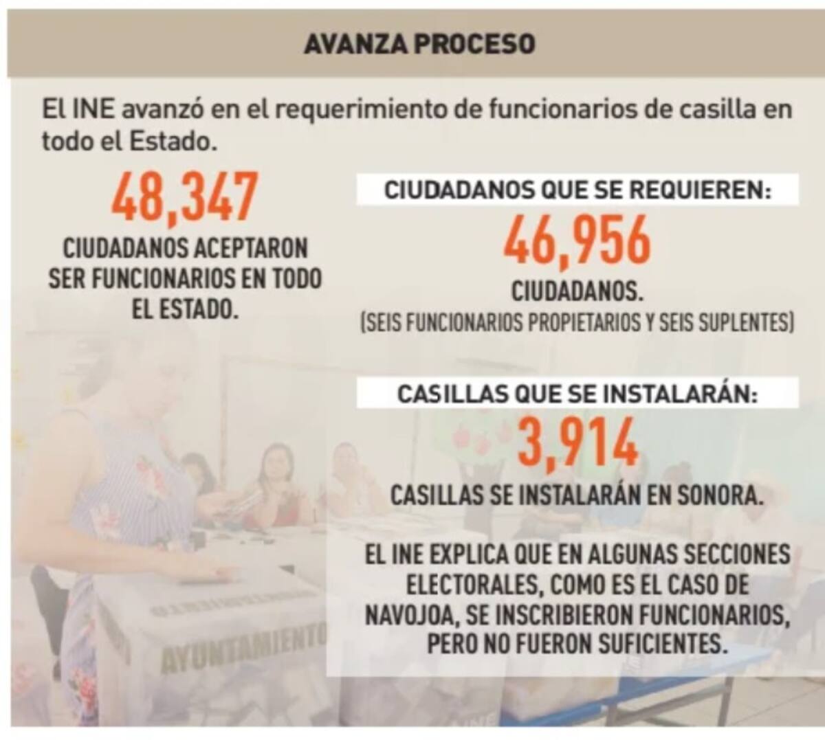 En Sonora se instalarán 3 mil 914 casillas para las cuales se requieren 35 mil 226 funcionarios, es decir seis propietarios y seis suplentes.