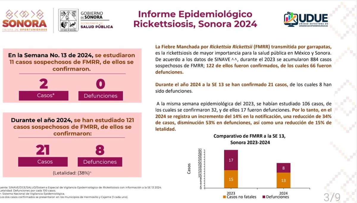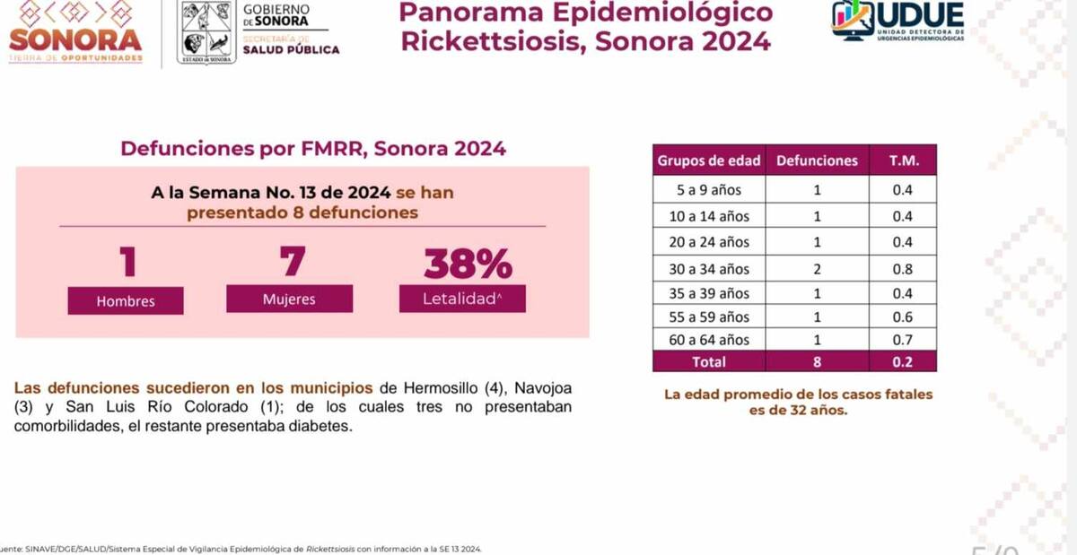 HERMOSILLO.- Sonora cerró el mes de marzo con 21 casos positivos de Rickettsia y 8 defunciones por la enfermedad, lo que representa una letalidad del 38% en el Estado.