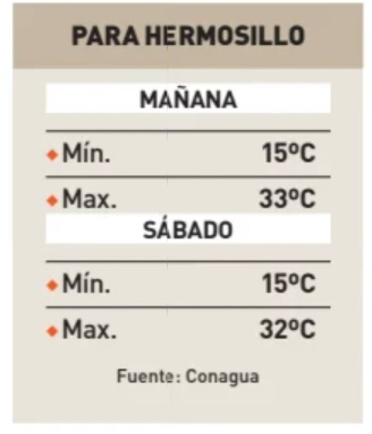 Se advierte que para la capital de Sonora se espera un ambiente cálido durante el día y fresco durante la noche y el amanecer, con vientos de 15 a 30 km/hr y rachas de hasta 45 km/hr, y un índice de rayos UV en un valor extremo de ocho a once.