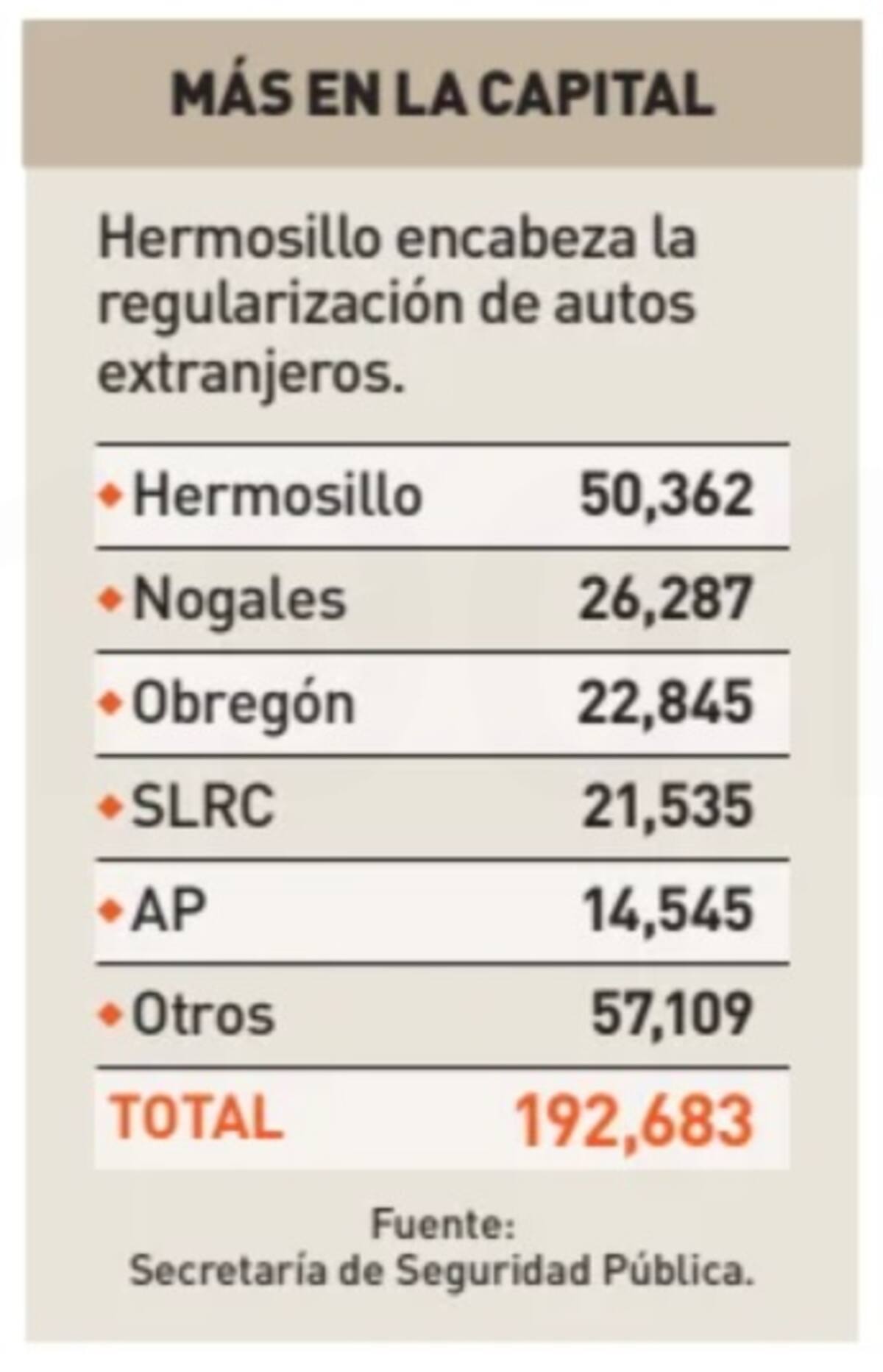 HERMOSILLO, Sonora.- Casi 500 millones de pesos ha acumulado el Estado de Sonora por la regularización de más de 192 mil autos de procedencia extranjera en el periodo del 21 de marzo de 2022 al 25 de abril de 2024 y aún continúa abierto el registro en la plataforma del Repuve.