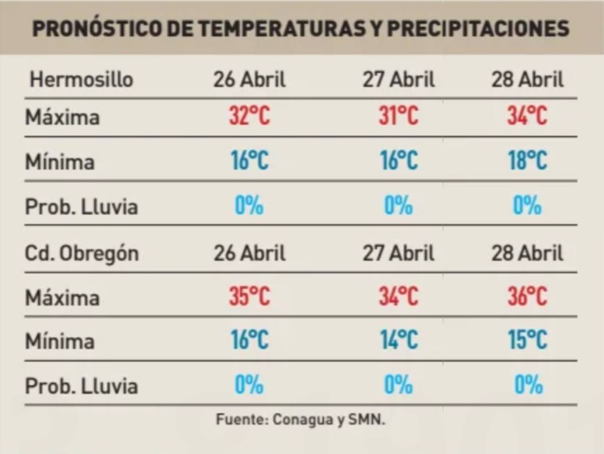 Se advierte que para la capital de Sonora se espera un ambiente cálido durante el día y fresco durante la noche y el amanecer, con vientos de 15 a 30 km/hr y rachas de hasta 40 km/hr, y un índice de rayos UV en un valor extremo de ocho a once.