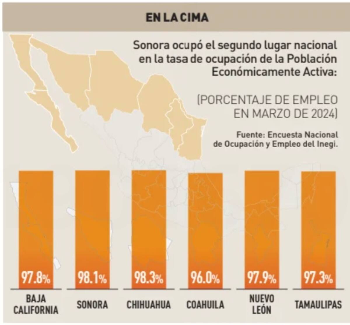 Sonora se posiciona como la segunda entidad fronteriza con la mayor Población Económicamente Activa. Registramos por primera vez un aumento histórico entre marzo de 2023 y marzo de 2024, alcanzando un 98.1%”, destacó.