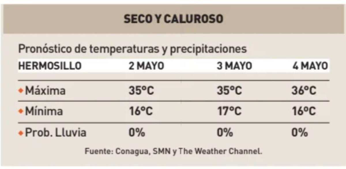 Para los siguientes días en Hermosillo, el termómetro se mantendrá en valores cercanos a los 35ºC, con cielos soleados a mayormente soleados y sin probabilidad de lluvias, de acuerdo a lo publicado por el SMN y The Weather Channel.