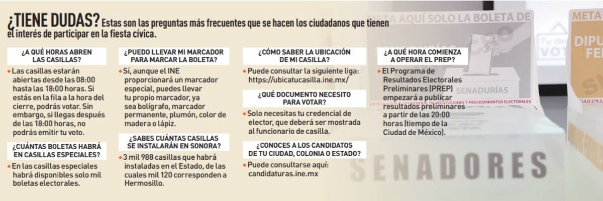 HERMOSILLO, Sonora.- Un total de 28 casillas especiales se instalan en el Estado, seis de ellas en Hermosillo, para que la población en tránsito pueda emitir su voto este 2 de junio.