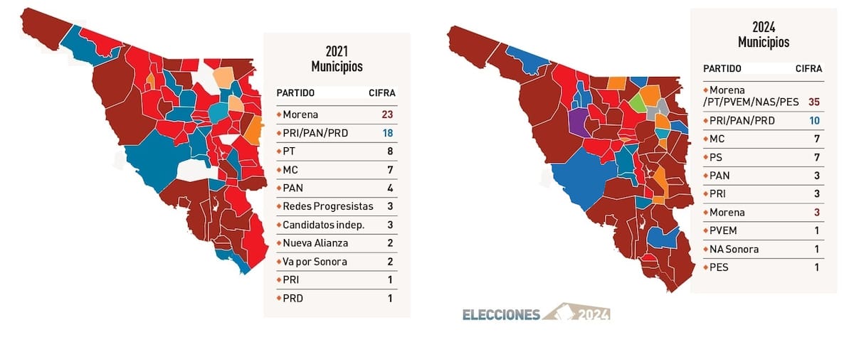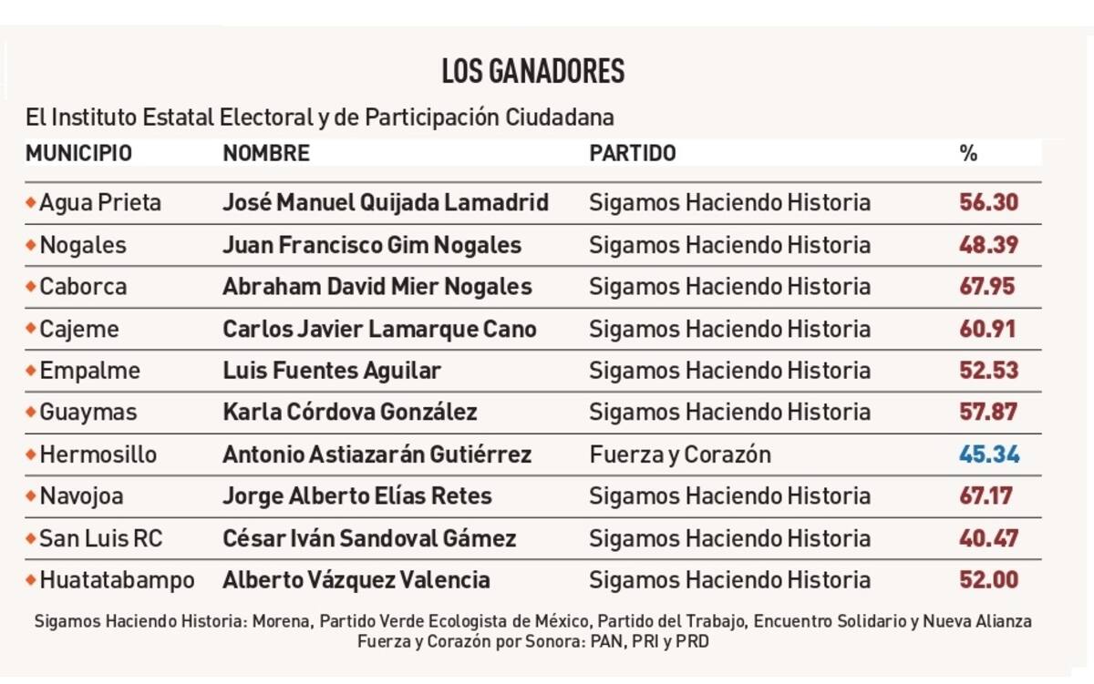 A excepción de Hermosillo, donde Fuerza y Corazón (PAN, PRI, PRD) obtuvo la mayoría de votos, los partidos de Sigamos haciendo historia obtuvieron ventaja en los municipios más grandes como Agua Prieta, Nogales, Caborca, Cajeme, Empalme, Guaymas y Navojoa.