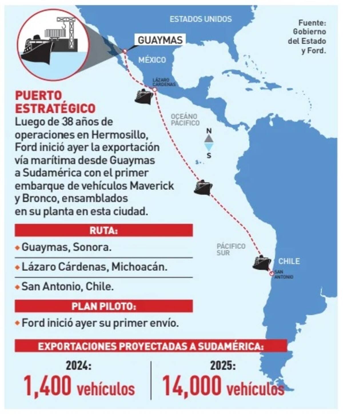 GUAYMAS, SONORA. Con el relanzamiento del puerto de Guaymas, el gobernador Alfonso Durazo, destacó que se convertirá en un centro portuario estratégico, un “nearshoring hub” en México, al realizarse ayer el envío del primer barco que llevará vehículos de Ford a Lázaro Cárdenas, Michoacán, con destino final a Chile.