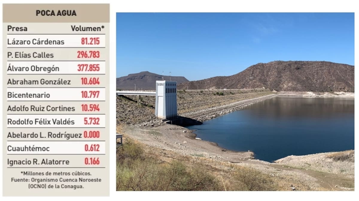 Según la dirección técnica del OCNO de la Conagua, el 26 de junio las presas reportaron 794.4 millones de metros cúbicos almacenados en las cuencas de los ríos Yaqui, Mayo, Sonora, Altar, y Mátape, lo que significan que están en 9.2% de su capacidad.