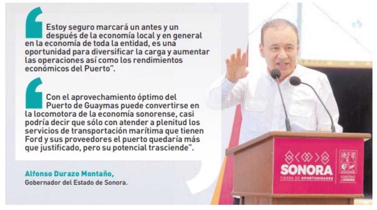 El puerto de Guaymas tendrá un rol central en las nuevas corrientes de comercio consolidando a Sonora como una tierra auténtica de nuevas oportunidades. Estaremos al lado de Ford acompañándolos invariablemente para facilitar que continúe el éxito de esta planta emblemática de nuestro Estado”, aseveró.