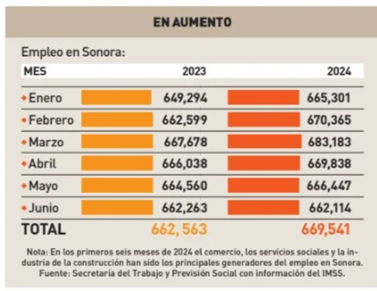 HERMOSILLO, Sonora.- De enero a junio de 2024 se han creado 6 mil 978 nuevos empleos en Sonora con relación al mismo periodo de 2023, y son el comercio, los servicios sociales y comunales y la industria de la construcción los mayores generadores.