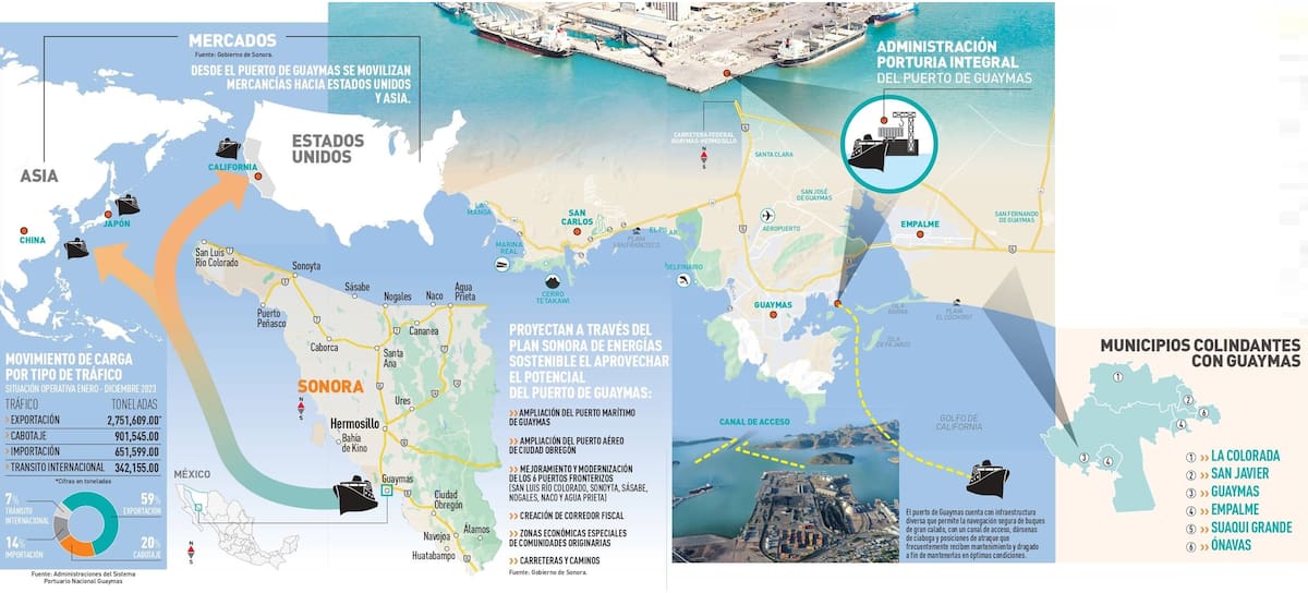 Con la ampliación del puerto, la integración del aeropuerto de Ciudad Obregón, el mejoramiento y modernización de seis puertos fronterizos, la creación de un corredor fiscal y la construcción de carreteras y libramientos, Guaymas se convertirá en el puerto estratégico para el movimiento comercial del Noroeste.