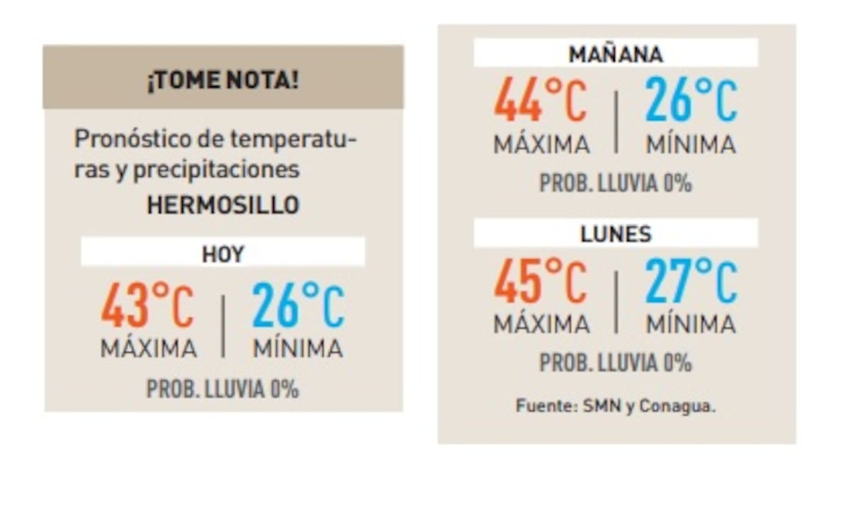 En el pronóstico del SMN se informa que seguirá la humedad presente en el Estado y eso generará que las temperaturas en la ciudad sean de entre 43ºC y 45ºC, al igual que en otras zonas de mayor calor, como la región Centro, Sur y Noroeste.