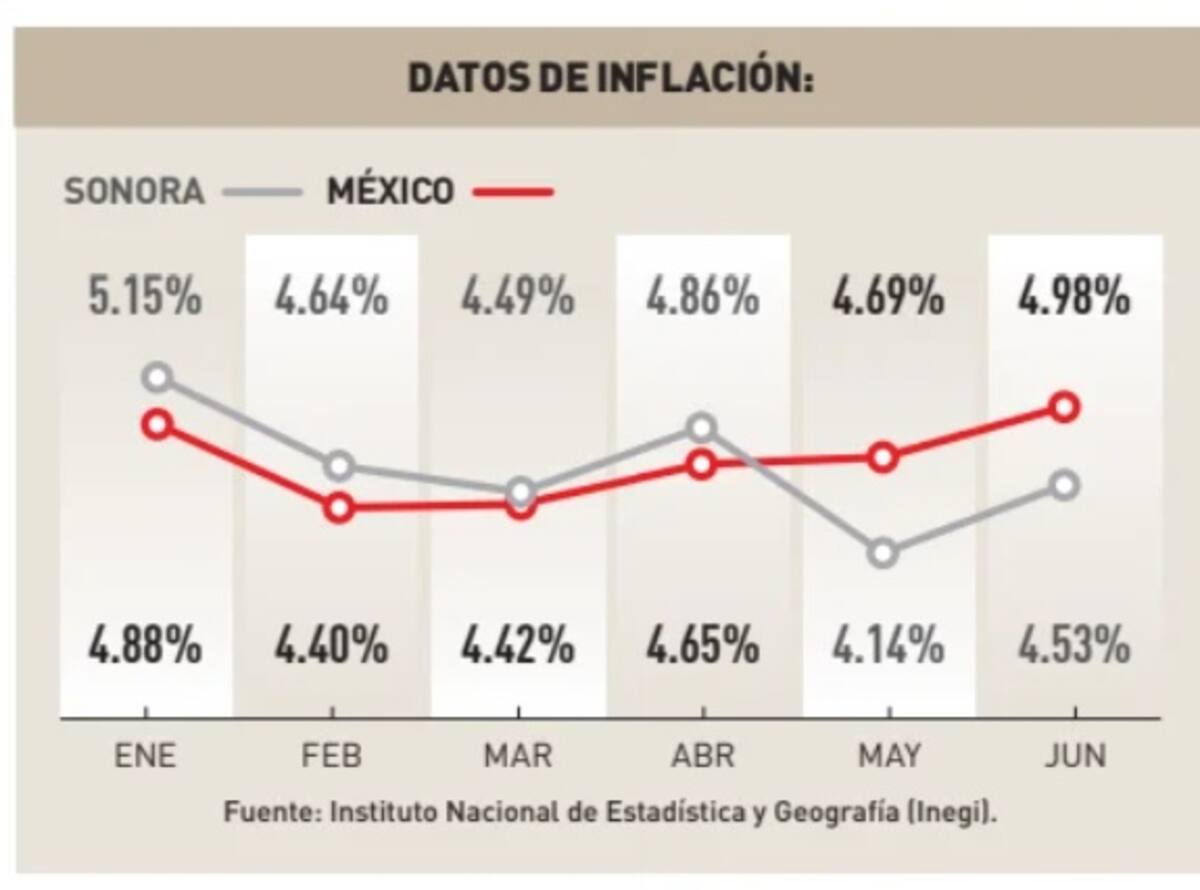 En enero la inflación superó la barrera del 5% al presentar 5.15%, en febrero bajó a 4.64%, en marzo siguió con tendencia a la baja con 4.49%, y en abril tuvo un salto al pasar a 4.86%, en mayo fue de 4.14% y en junio de 4.53%.