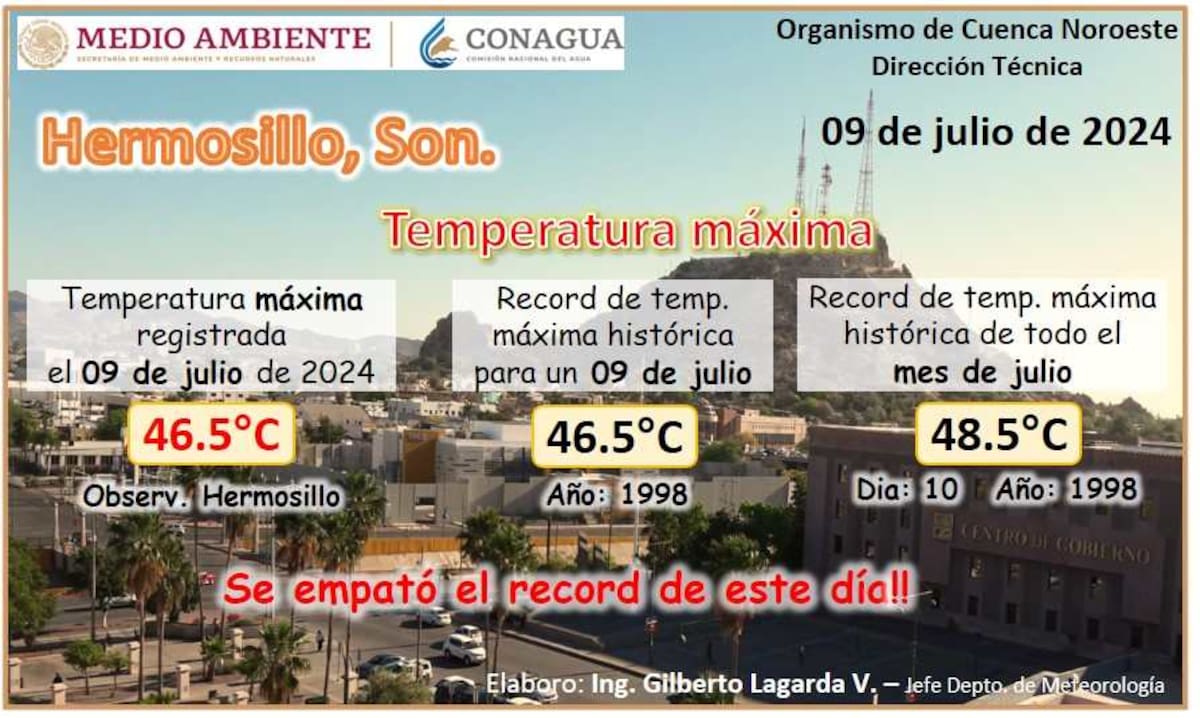 Gilberto Lagarda de Conagua Sonora, informó que se igualó el record de temperatura en un 9 de julio, ya que 1998 también se llegó a los 46.5ºC en la capital sonorense.