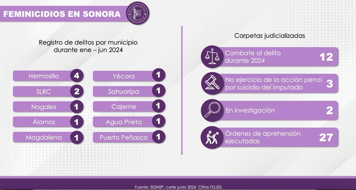Hermosillo, Sonora.- En relación a la publicación emitida por el Observatorio Sonora por la Seguridad sobre feminicidios en la entidad, la Fiscalía General de Justicia del Estado de Sonora (FGJES) informa que en lo que va del 2024, se han atendido 17 casos por el delito de feminicidio, de los cuales se han judicializado 12 asuntos, 2 están en investigación y en 3 de ellos los imputados cometieron suicidio por lo que se extinguió la acción penal.