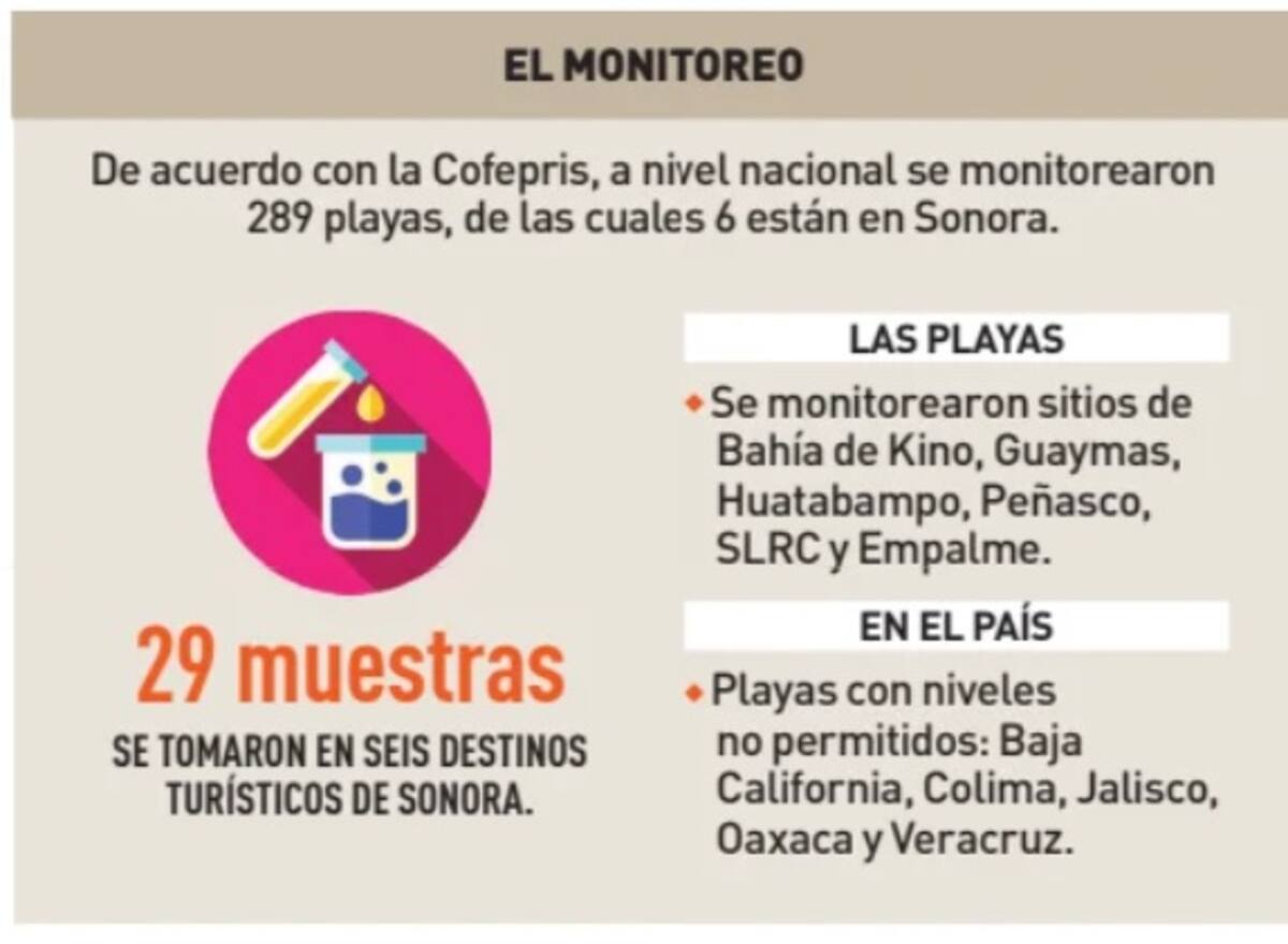 El monitoreo de Cofepris en Sonora se realizó entre el 25 de junio y el 3 de julio en lugares de Bahía de Kino, Guaymas, Huatabampo, Puerto Peñasco, San Luis Río Colorado y Empalme.