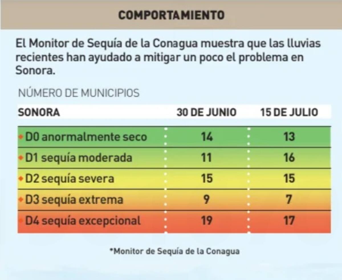 El territorio de Sonora con sequía en grado D3 y D4, es decir sequía extrema y sequía excepcional, respectivamente, pasó de 35.4% en el registro al 30 de junio a 25.8% en el último dato registrado al 15 de julio.