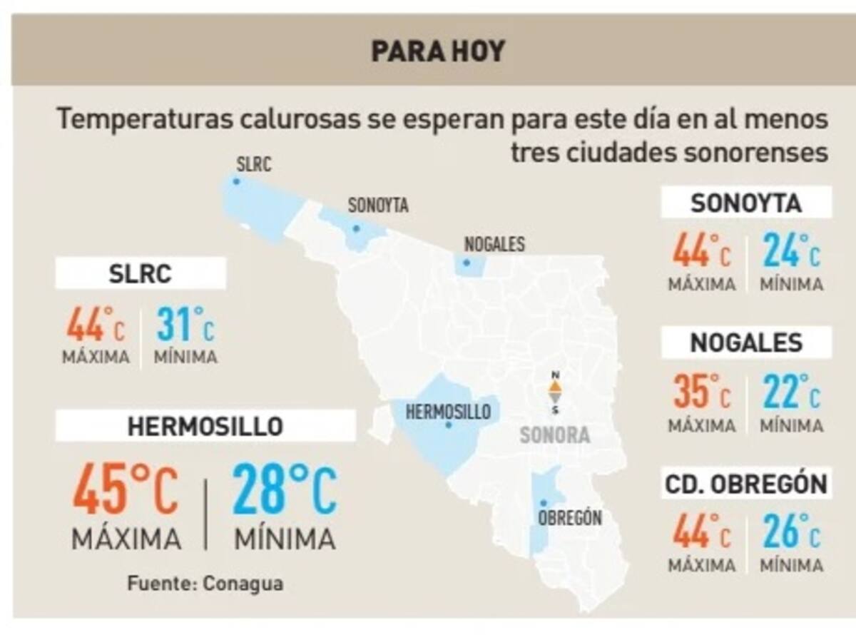 El pronóstico para hoy en la capital del Estado es de máxima de 45°C y mínima de 28°C, para mañana domingo es de máxima de 45°C y mínima de 29°C.