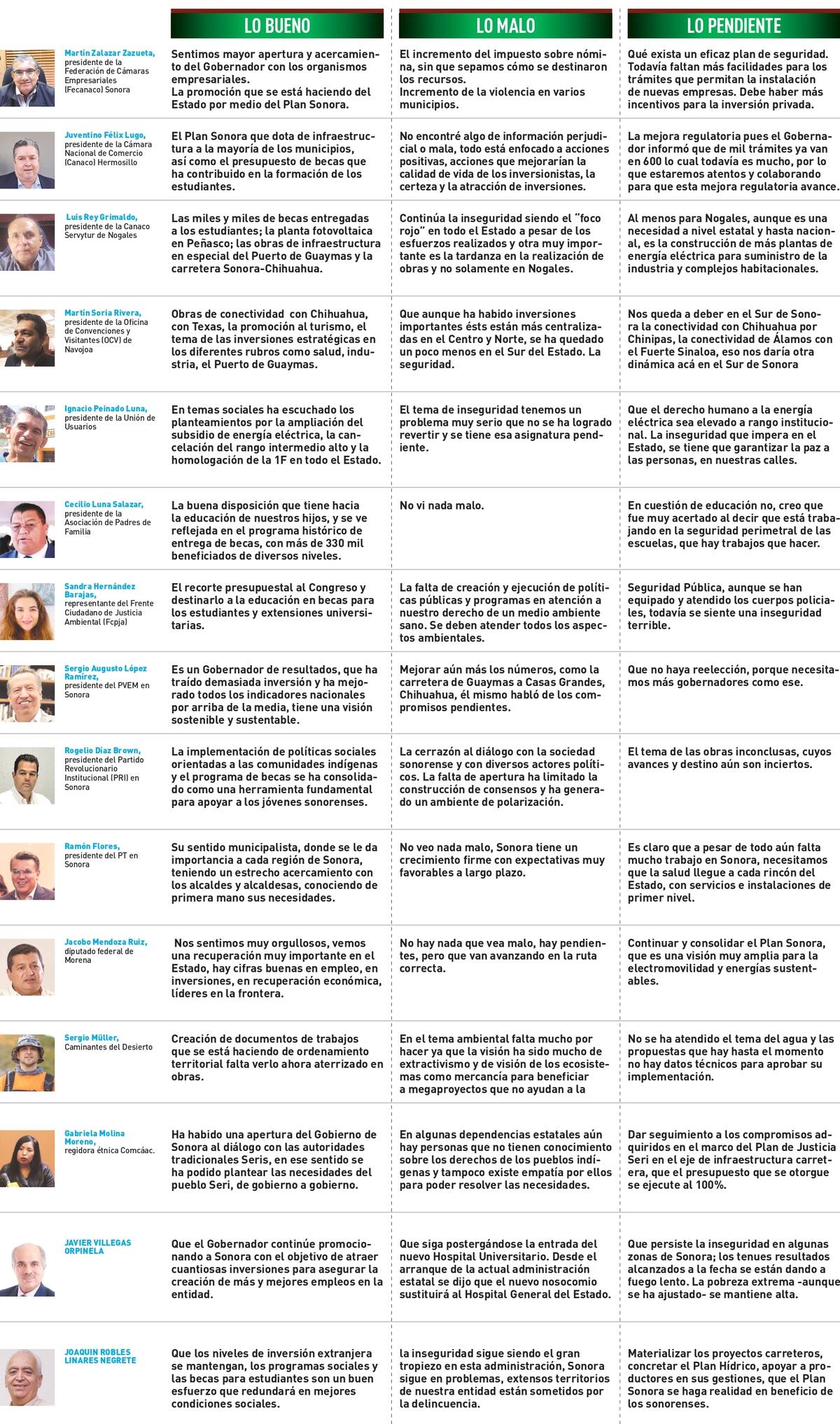 Representantes del sector privado, partidos políticos y organizaciones de la sociedad civil de Sonora compartieron sus puntos de vista sobre el contenido del mensaje que dirigió a los sonorenses el gobernador Alfonso Durazo luego de la entrega de su Tercer Informe de Gobierno al Congreso del Estado.