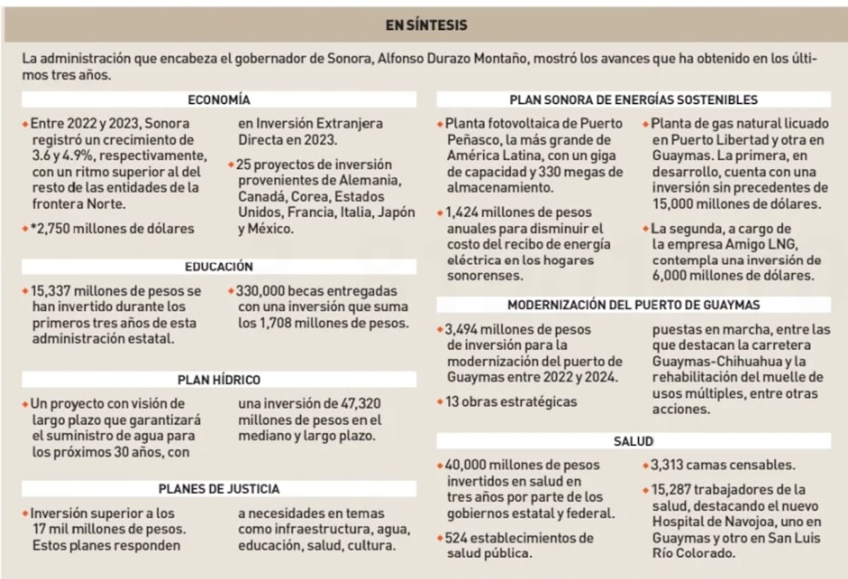El Ejecutivo estatal detalló que uno de ellos es el Plan Sonora de Energías Sostenibles, además del Plan Hídrico, el programa de becas Sonora de Oportunidades, así como la modernización del Puerto de Guaymas y Planes de Justicia para Pueblos Originarios.