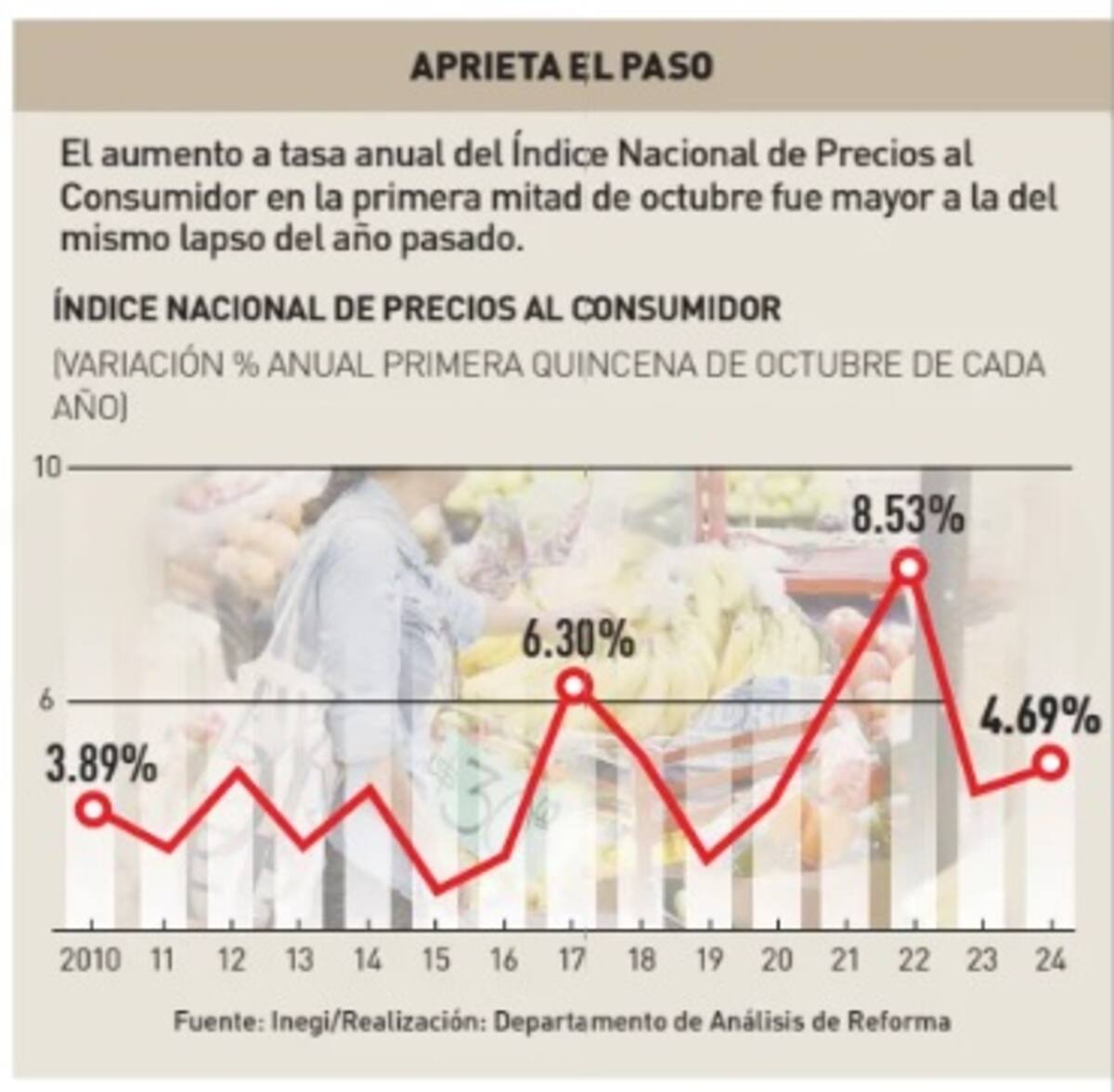 El incremento general de precios en la primera quincena de octubre estuvo por arriba del consenso de los analistas que era de 4.66% a tasa anual, pero dentro del rango de sus expectativas que iban de un mínimo de 4.58% a un máximo de 4.82% previsto por las 35 instituciones financieras consultadas por CitiBanamex, de las cuales sólo dos acertaron en su pronóstico.