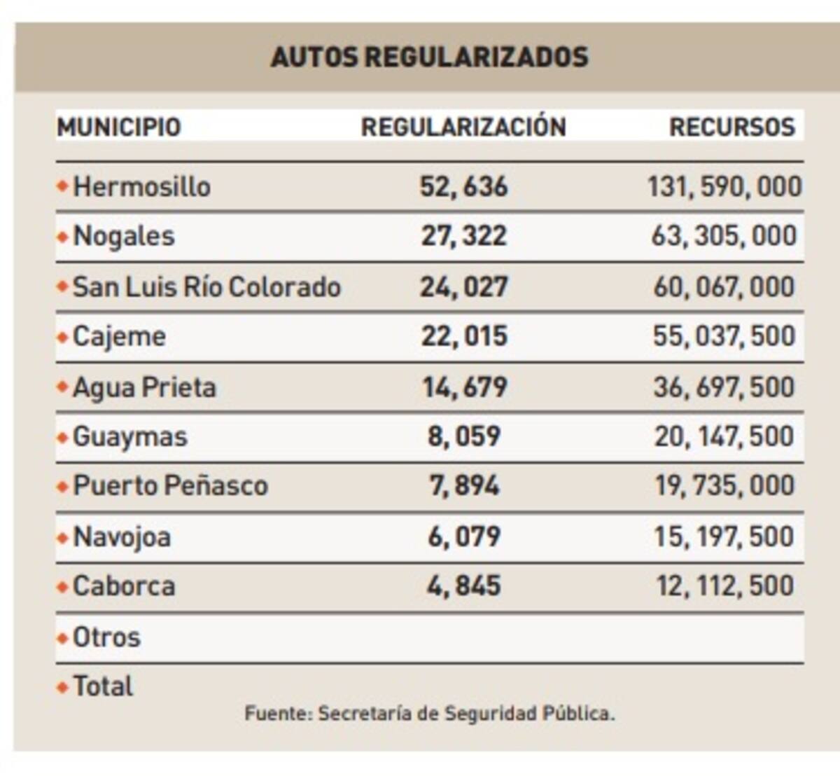 Según datos de la Secretaría de Seguridad Pública, Hermosillo es el municipio que más vehículos de procedencia extranjera ha regularizado en la entidad, al sumar 52 mil 636, lo que significan 131 millones 590 mil pesos que han sido destinados para la rehabilitación de vialidades.
